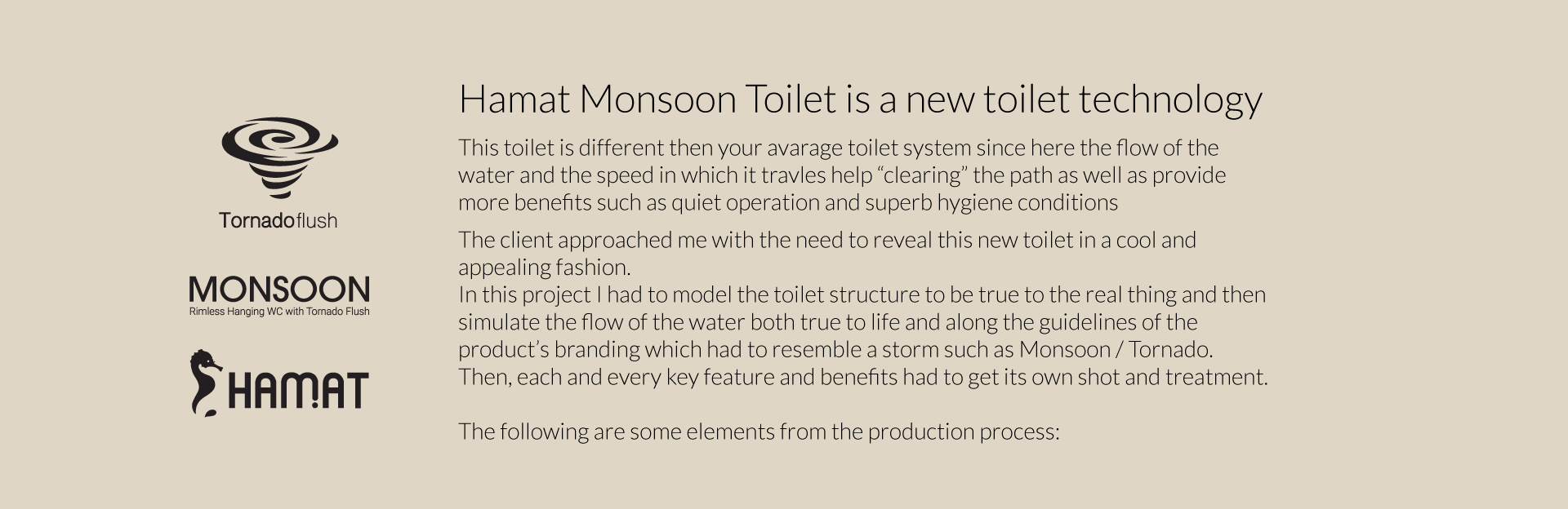 This toilet is different then your average toilet system since here the flow of the water and the speed in which it travels help “clearing” the path as well as provide more benefits such as quiet operation and superb hygiene conditions. The client approached me with the need to reveal this new toilet in a cool and appealing fashion. In this project I had to model the toilet structure to be true to the real thing and then simulate the flow of the water both true to life and along the guidelines of the product’s branding which had to resemble a storm such as Monsoon / Tornado. Then, each and every key feature and benefits had to get its own shot and treatment.